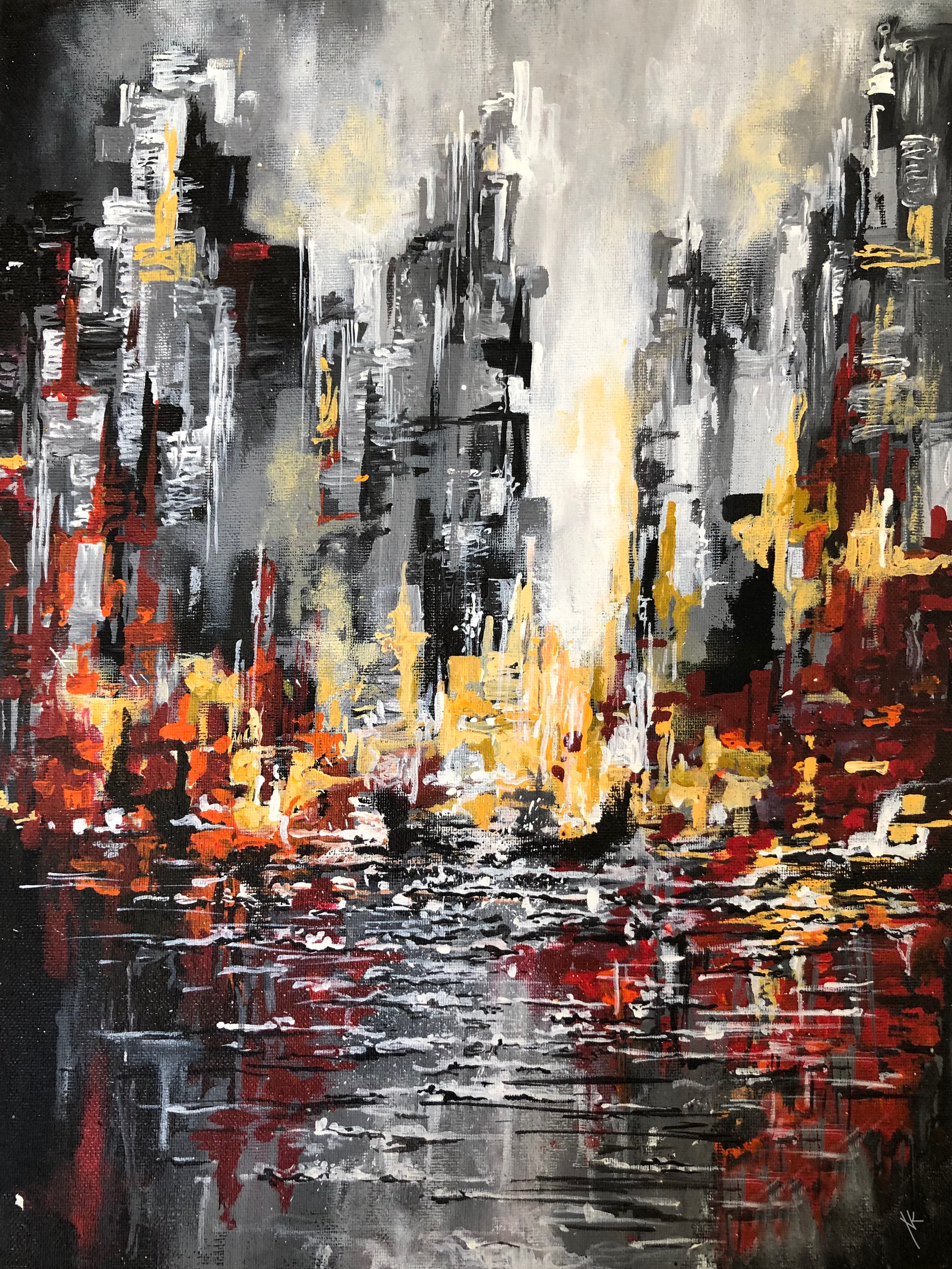 "Liminal Echoes" captures the fleeting essence of Mumbai’s rhythm—moments suspended between the chaos of the local trains and the calm of a vada pav break under grey monsoon skies. The painting immerses viewers in the collective yet solitary experience of navigating the city's liminal spaces, where strangers briefly cross paths before fading into the background of urban hum.